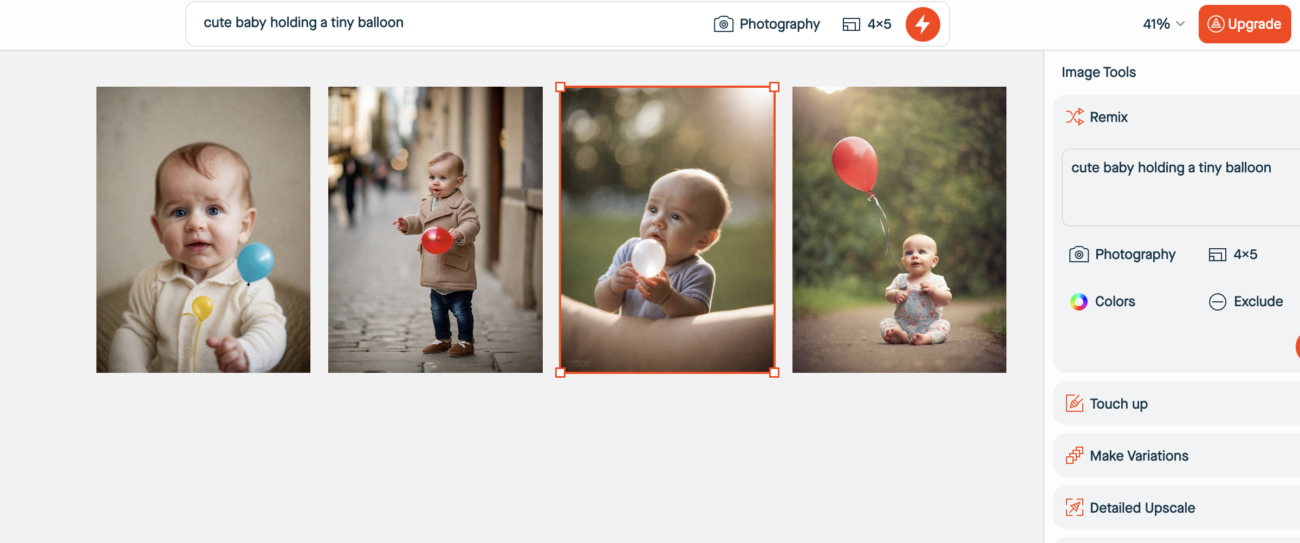 「cute baby holding tiny balloon」というプロンプトで、こちらの4枚が生成されました。
